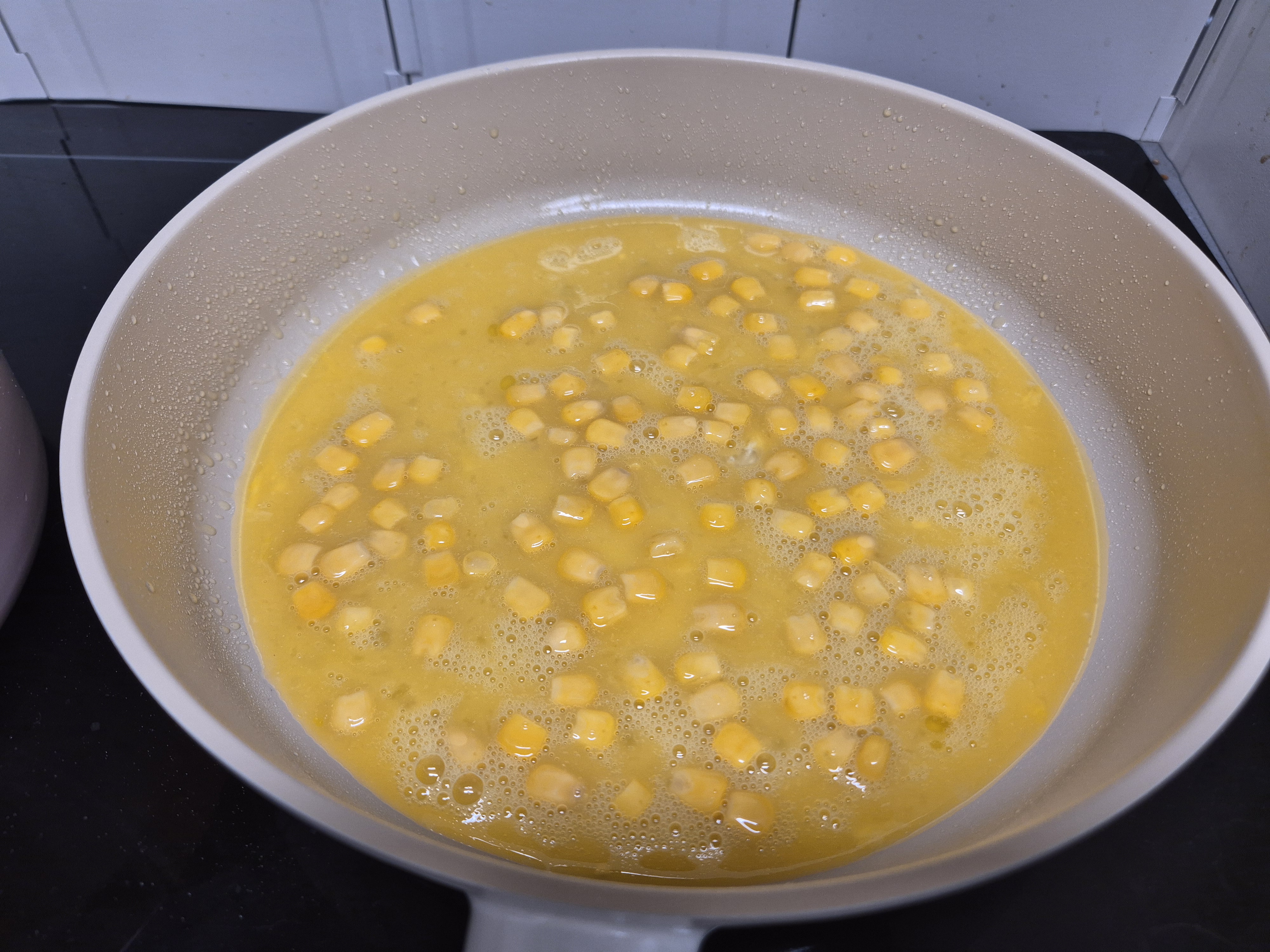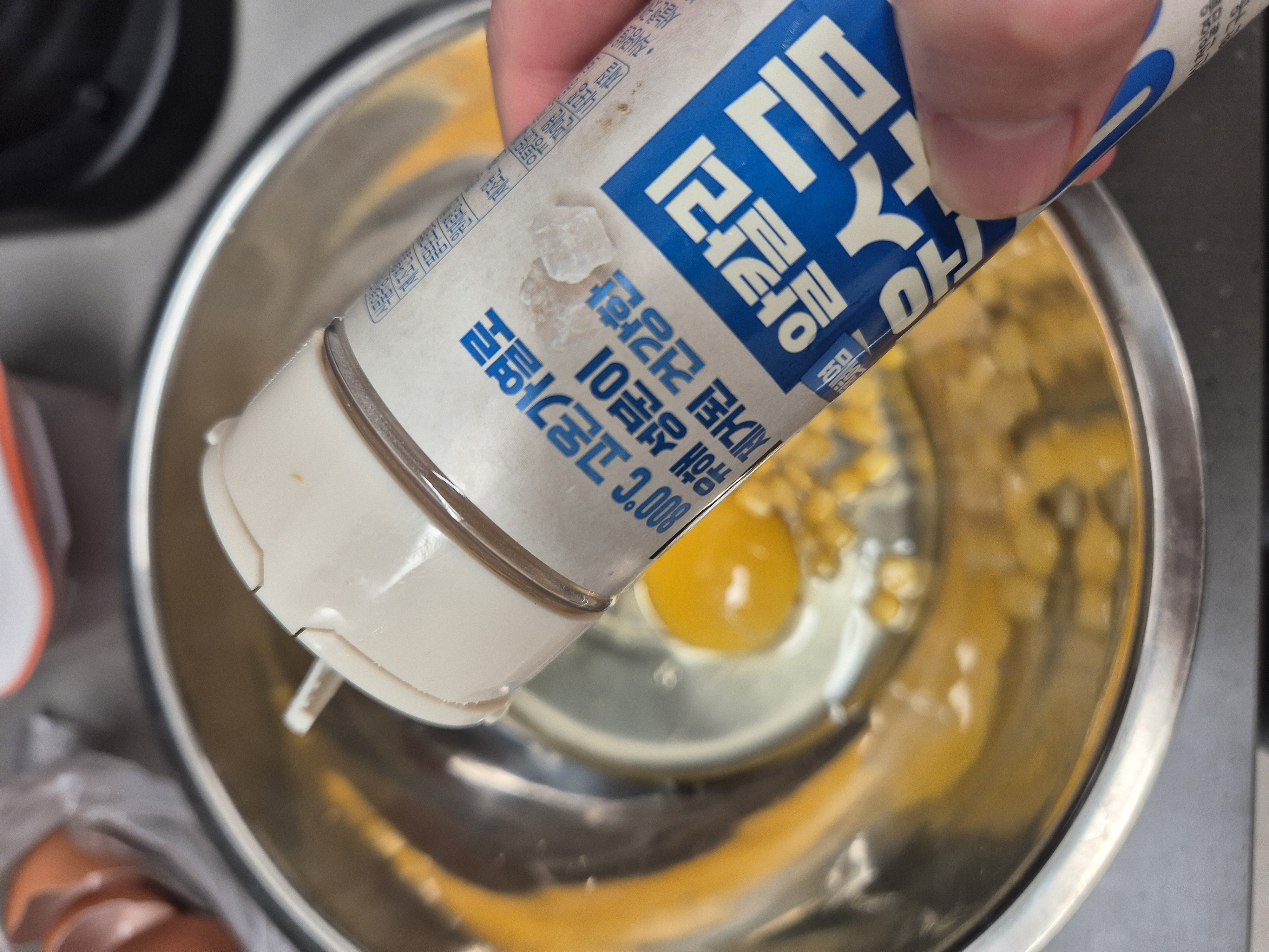 2. 계란 1개 풀고 스위트콘 1숟갈, 소금 약간 섞어주기